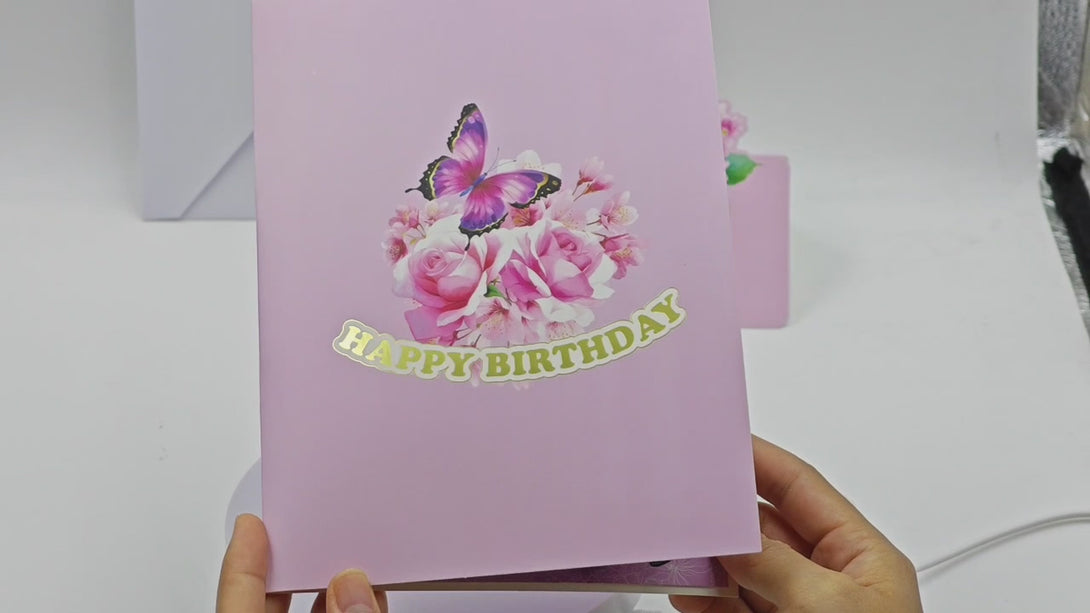 Description: Upon opening the card, a three-dimensional floral display springs to life alongside a magnificent large butterfly, with smaller butterflies fluttering gracefully around it. At the centre, the words ‘Happy Birthday’ are presented in gold embossing.