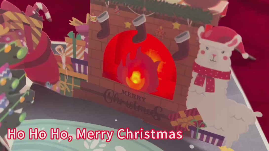 Description: Upon opening, a fireplace with a crackling fire appears, and Father Christmas is seen climbing the Christmas tree. He blows upon the star at the tree's summit, causing the lights to illuminate and Christmas music to play. Another breath extinguishes both the lights and the music.