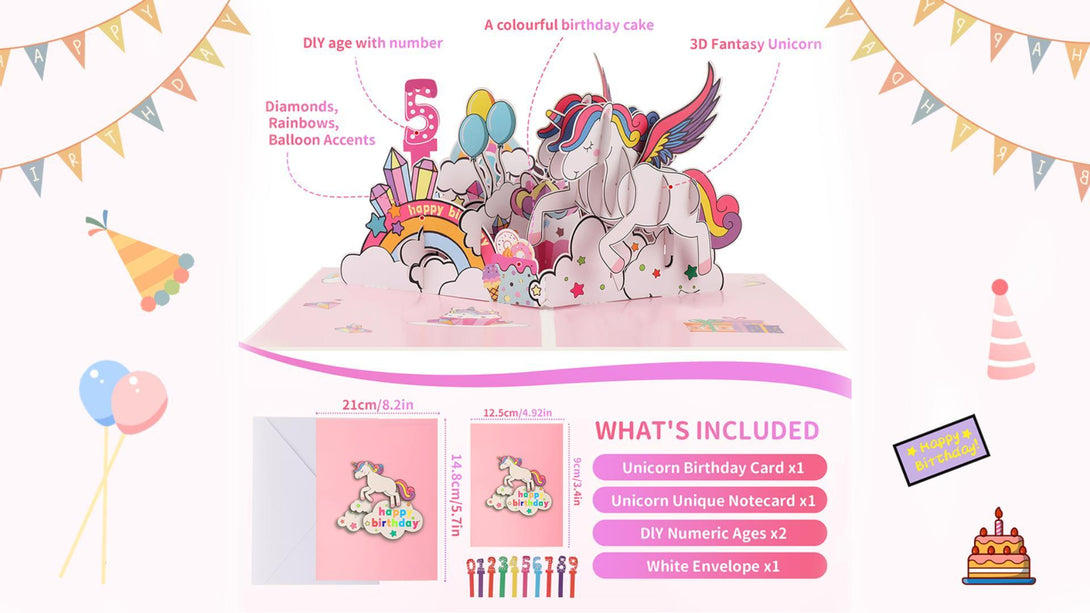 Description:Surprise your fairy tale enthusiast with this magical pop-up card! A glitter unicorn performs cartwheels through candy-cane clouds, hooves launching starburst confetti – perfect for sparking joy in any age group.